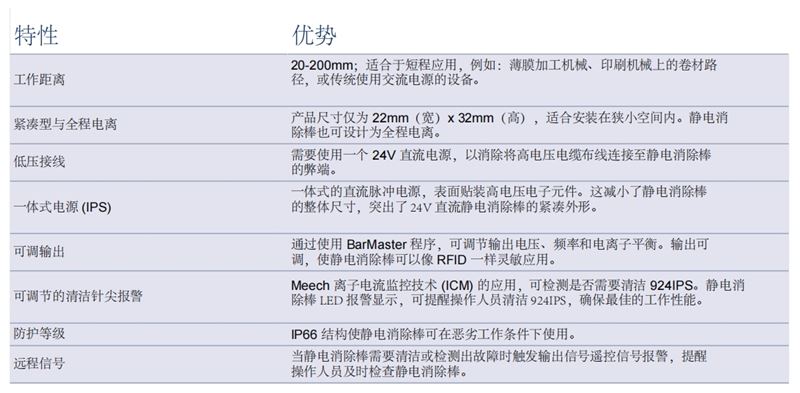 由 24V 直流电源供电,是市场上的脉冲直 流静电消除棒,是采用 24V 直流供电的静电 消除棒,易于安装在通常需要使用传统交流静电 消除棒的机器上。 如同其它 Hyperion 产品一样,924IPS 静电消除 棒应用了 Meech 公司的离子电流检测 (ICM) 技 术,以确保当需要清洁静电消除棒时,实现本地 和远程报警功能。 924IPS 静电消除棒性能可调,BarMaster 程序 兼容,尤其适合于在恶劣环境中使 用。924IPS 静电消除棒是应用了输出电 压、频率和电离子平衡可调技术的 Hyperion 静 电消除棒产品。这些功能使 924IPS 静电消除棒 适用于特殊用途,包括诸如 RFID 非常灵敏的应用。